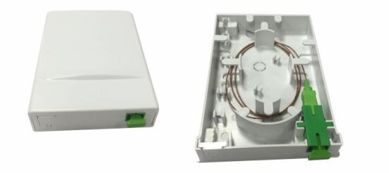 This wall box enables the installation of either Drop cable or ruggedized cables to be spliced to 1 SC Pigtail.