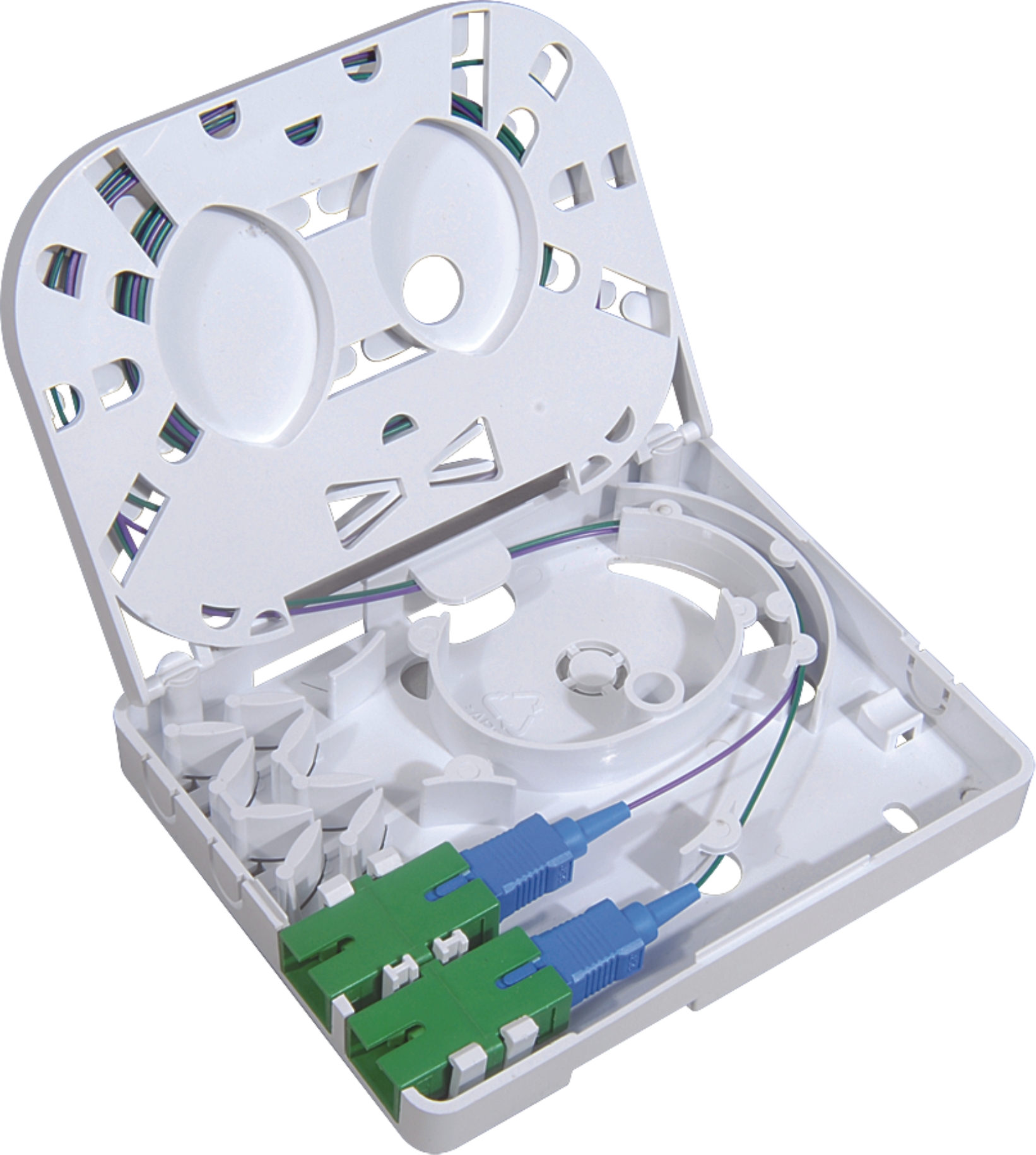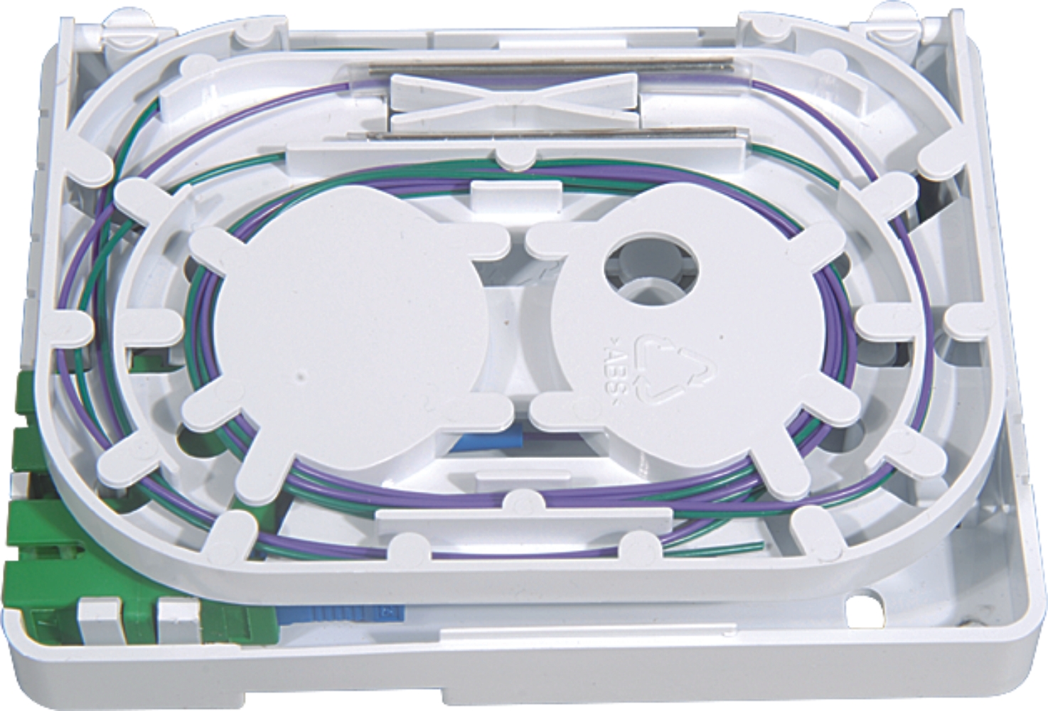 This wall box enables the installation of either Drop cable or ruggedized cables to be spliced to 2 SC Pigtails.
