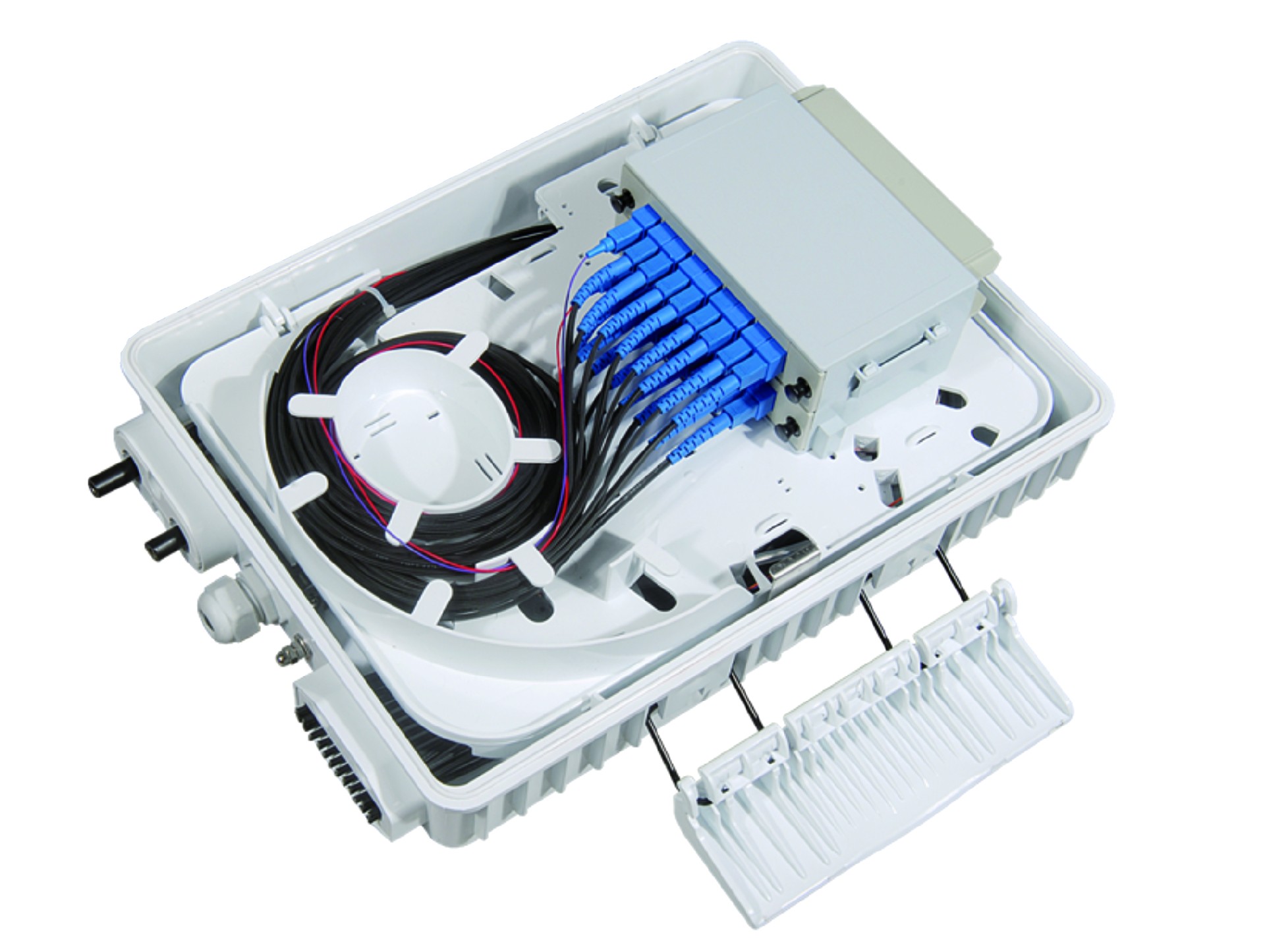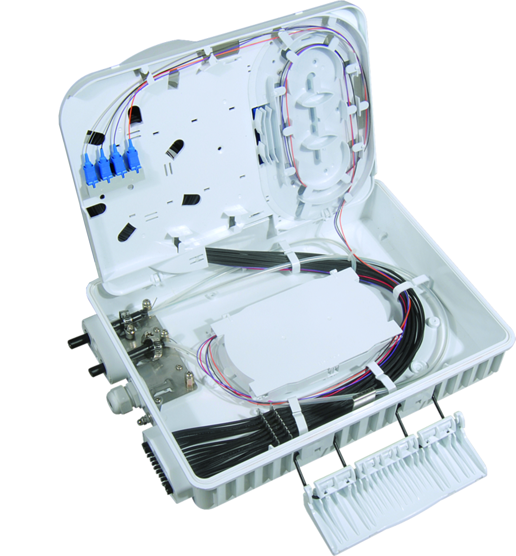 FDB-G-16K is used as a termination point for the feeder cable to connect with drop cable in FTTx communication network system. The fiber splicing, splitting and distribution can be done in this box, and in meanwhile, it provides solid protection and management for the FTTx network building