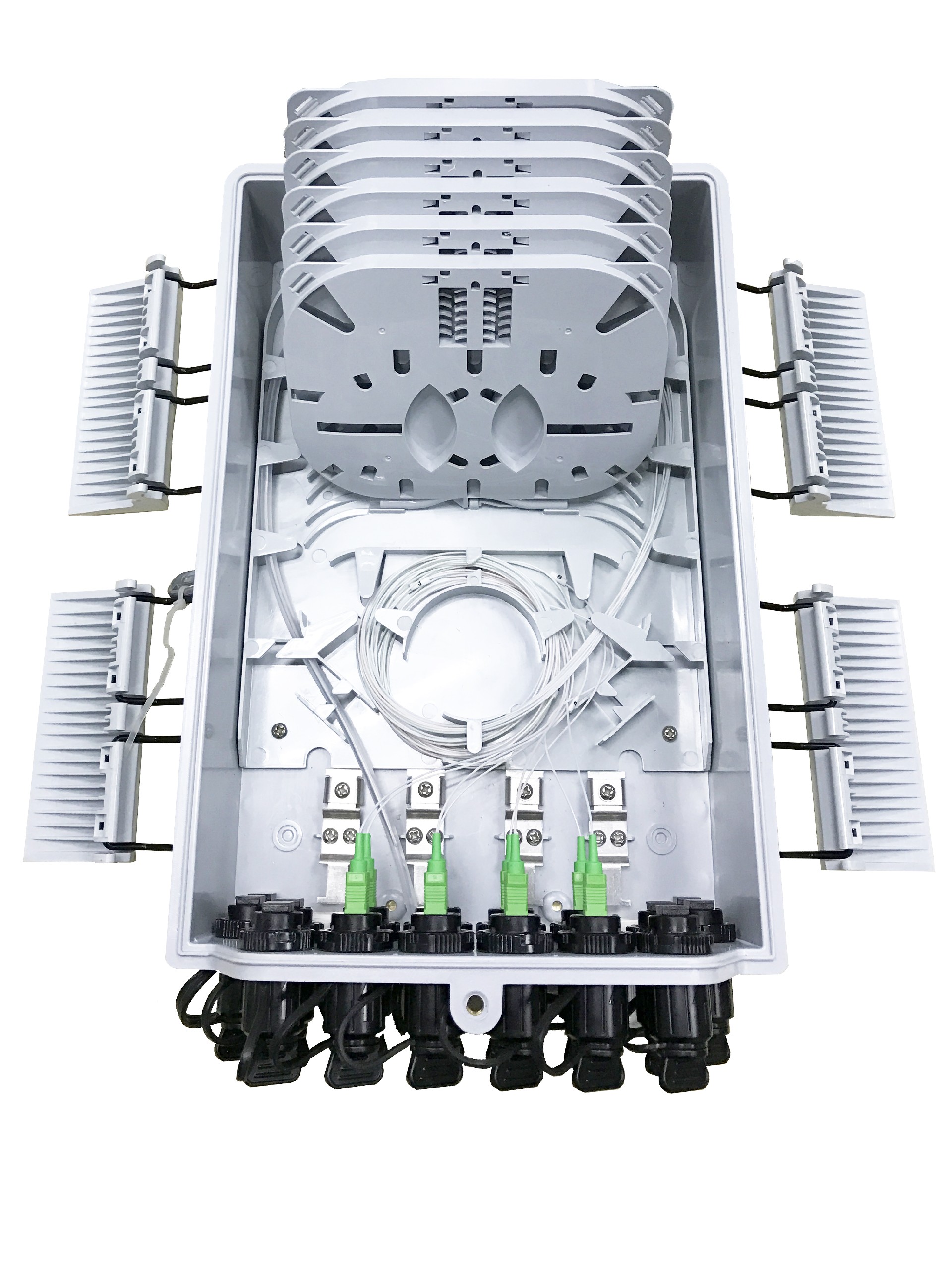 FDB-G-16S is used as a termination point for the feeder cable to connect with drop cable in FTTx communication network system. The fiber splicing, splitting and distribution can be done in this box, and in meanwhile, it provides solid protection and management for the FTTx network building
